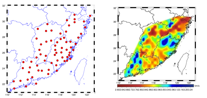 图2  福建区域噪声成像动态监测系统和地下层析成像图(图片来源:福建省地震局,2011)