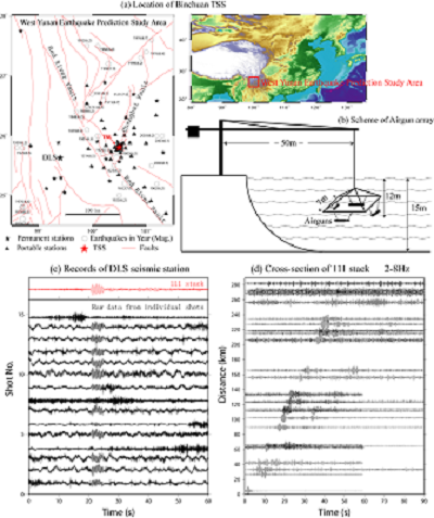 图6.宾川可控源发射台位置及其部分研究结果。 (a)滇西地震预报试验场位置;(b)气枪阵列示意图;(c)距发射台112公里的DLS台记录的原始信号及叠加结果; (d)气枪信号追踪地下至240公里。(图片来源:王宝善,2013)